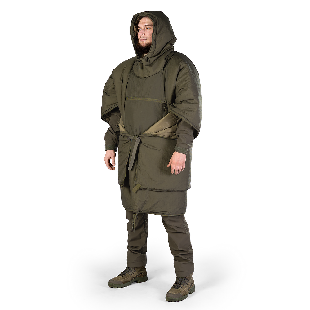 Утеплене пончо-трансформер Кірея Олива — це універсальний елемент екіпірування для холодного сезону. Виготовлене з водозахисного нейлону з інноваційним утеплювачем X-Loft, воно поєднує в собі функції теплого пончо, ковдри та навіть спальника.