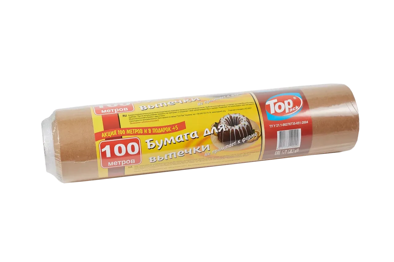 Пергамент для випікання Toppack — надійний та зручний помічник на кухні. Виготовлений із силіконізованого паперу коричневого кольору, шириною 29 см та довжиною 100 м. Матеріал витримує температуру до 230°С, що робить його ідеальним для приготування хлібобулочних і кондитерських виробів.