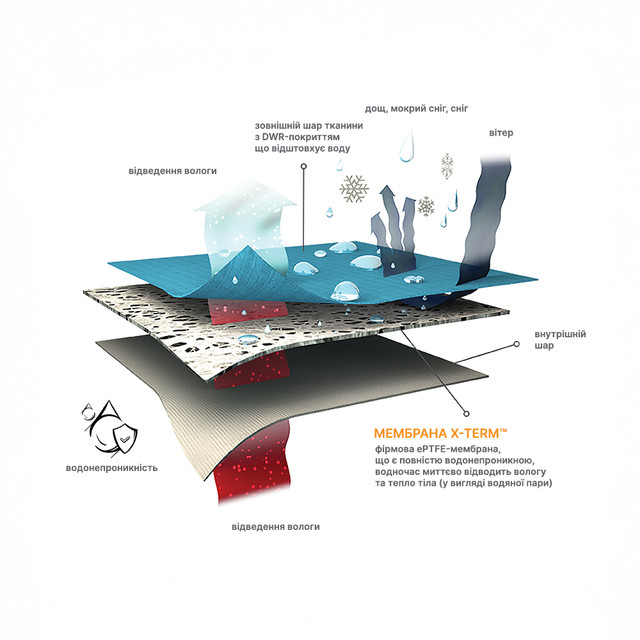 Мембрана знаходиться в сендвіч-конструкції з двох матеріалів: міцна зовнішня поліестерова тканина з Rip-Stop плетінням для захисту від розривів та «дихаючий» внутрішній текстиль для відведення вологи.